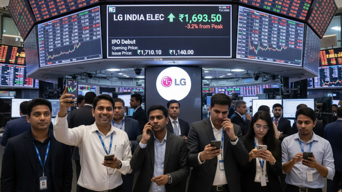 LG Electronics India shares declined after their initial surge on October 14, 2025, following a spectacular stock market debut. The shares made an intraday high of ₹1,749 on the National Stock Exchange (NSE) but were trading at ₹1,693 around 12:45 p.m., down 3.2% from the peak.