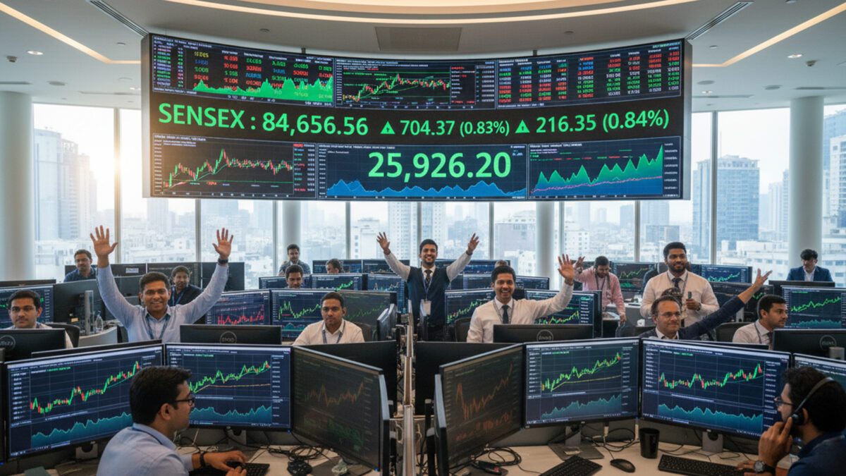 The 30-share BSE Sensex surged 704.37 points, or 0.83%, to an intraday high of 84,656.56, while the 50-share NSE Nifty advanced 216.35 points, or 0.84%, to 25,926.20.