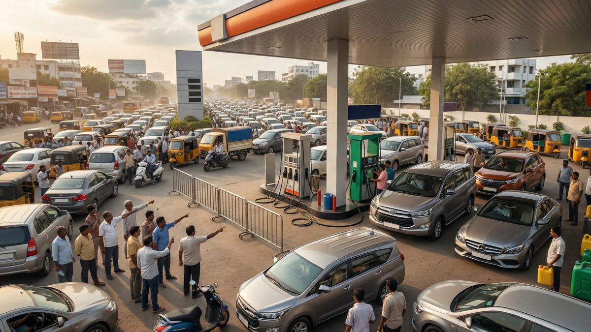Long queues formed at petrol pumps in Gujarat and Hyderabad on Tuesday as several outlets ran out of regular petrol, forcing motorists to buy premium fuel priced about ₹10 higher per litre. The rush was triggered by rumours of shortages on social media, not by actual supply issues.