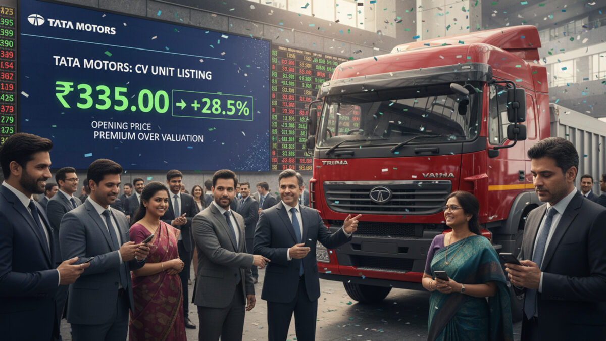 Tata Motors’ newly separated commercial-vehicles business made a strong market debut. The stock opened at around ₹335 per share, about 28% higher than its pre-listing implied value of ₹261. It later climbed to roughly ₹345, signaling strong investor interest.